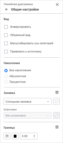 Для настройки вида отображения, типа накопления, заливки фона и границы диаграммы используйте группу параметров «Общие настройки» панели параметров.