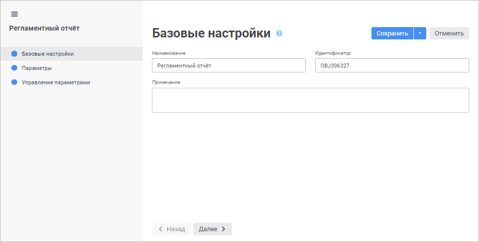 Мастер открывается на странице «Базовые настройки». Базовые настройки включают в себя наименование, идентификатор и примечание отчёта.