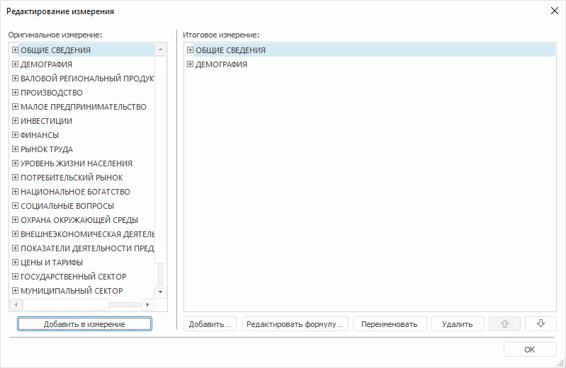 В области «Оригинальное измерение» отображаются элементы измерения до редактирования. В области «Итоговое измерение» - список элементов после редактирования.