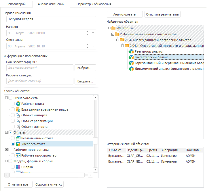 Анализ изменений объектов предназначен для получения информации об изменении объектов репозитория в зависимости от заданных параметров. Для анализа изменений объектов должно быть настроено ведение аудита действий субъектов безопасности и истории изменений объектов по выбранным операциям в менеджере безопасности.