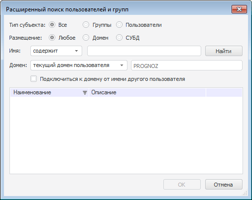 Любое. При установке данного переключателя, поиск будет производиться среди доменных субъектов и субъектов СУБД;