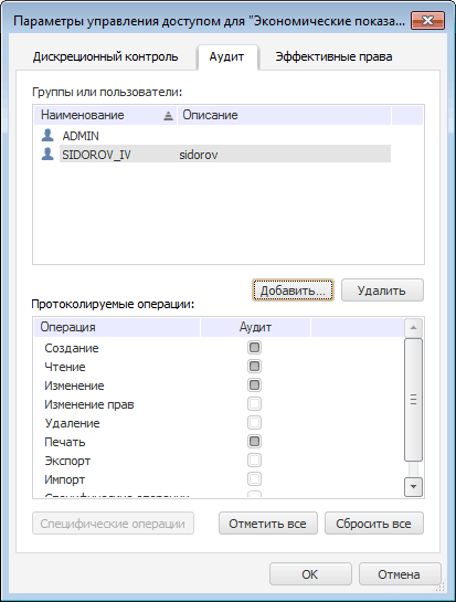 Для протоколирования выбранных операций установите напротив них флажки. В списке возможна множественная отметка операций. Для разных типов объектов список специфических операций отличается.