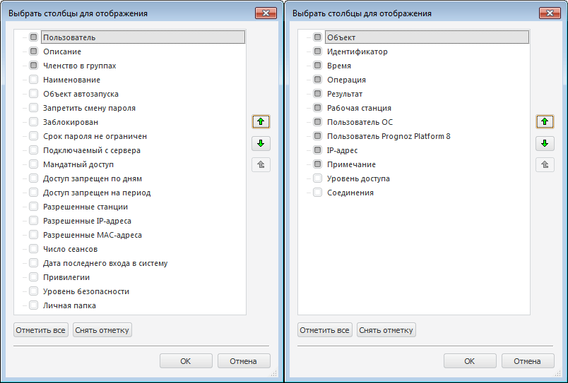 При выборе пункта «Выбрать столбцы» будет открыт диалог «Выбрать столбцы для отображения» (слева – для раздела «Пользователи», справа – для раздела «Протокол»):