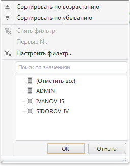 Первые две строки содержат способы сортировки: «Сортировать по возрастанию» и «Сортировать по убыванию». При установленной сортировке направление сортировки отображается в заголовке соответствующего столбца.