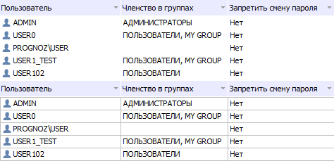 Для включения/отключения отображения сетки установите/снимите флажок «Отображать сетку» в главном меню «Вид». По умолчанию список пользователей отображается без сетки. Ниже приведен пример отображения без сетки и с сеткой: