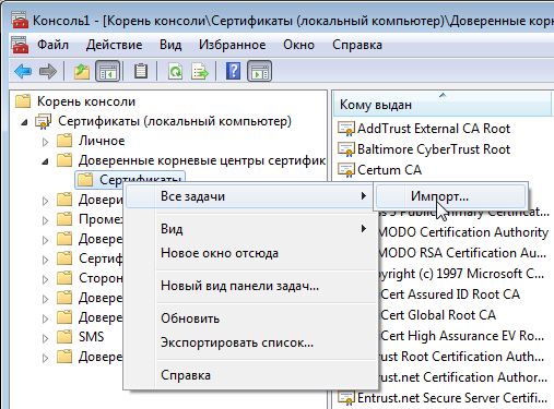 Импортируем, ранее созданный сертификат, в папку «Доверенные корневые центры сертификации -> Сертификаты»: