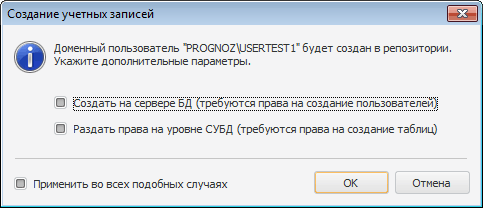 При установке флажка «Создать на сервере БД» добавляемый пользователь будет создан на сервере БД, при этом будет выдан запрос имени и пароля пользователя, обладающего правами создания пользователей;