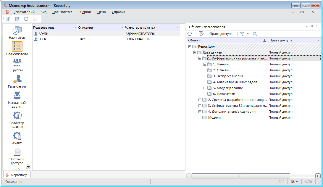 Пользователи являются субъектами безопасности системы, которые наделены определенными правами для работы с объектами репозитория. Права могут быть получены явно (если права определены отдельно для пользователя) и неявно (если права унаследованы от группы пользователей).