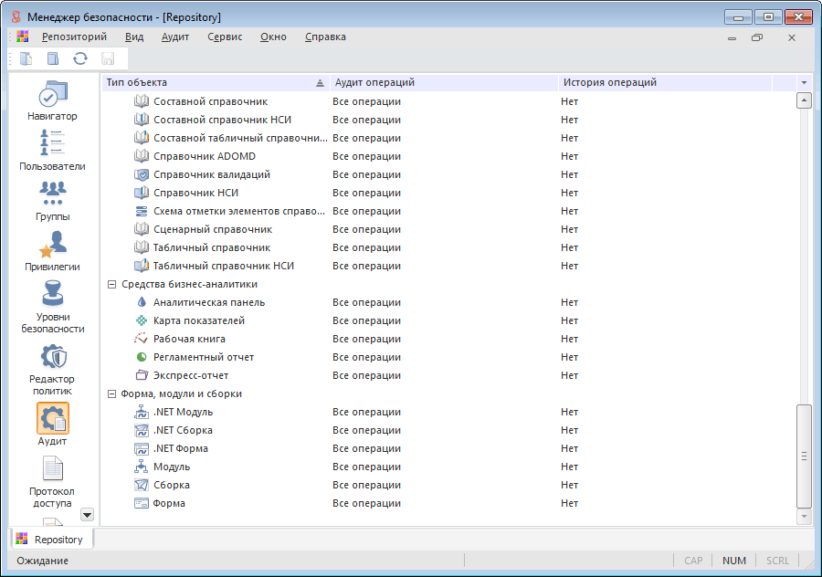 Аудит операций. Отображает перечень действий, которые заносятся в протокол доступа;