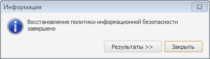 После восстановления политики информационной безопасности выдаётся запрос на обновление пользователей. Обновление пользователей необходимо для корректной работы. В случае положительного ответа происходит запуск механизма обновления пользователей. Окончание процесса сопровождается сообщением о завершении восстановления политики безопасности: