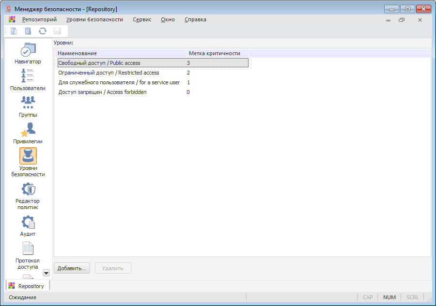 В разделе определяется список уровней безопасности. В списке «Уровни» отображаются уровни и их метки критичности.