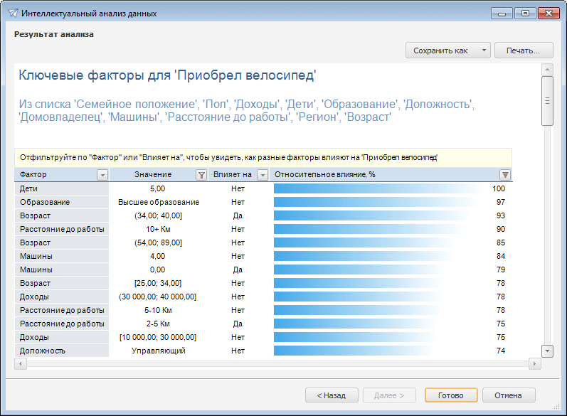 анализ ключевых факторов. С помощью анализа закономерностей выявляются наиболее значимые факторы и устанавливается степень влияния каждого фактора на изучаемое явление. Например, есть список клиентов, содержащий различные сведения о них и данные о том, купили ли они велосипед за последний год. Анализ ключевых факторов позволяет определить, что именно повлияло на покупку велосипеда и, например, в какой именно степени возраст влияет на покупку велосипеда;