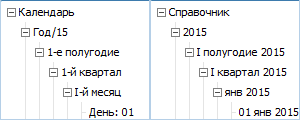 После выполнения примера в календарный справочник будет добавлен новый пользовательский атрибут. Для элементов всех уровней будут заданы различные форматы наименования элементов (изображение слева), которые отличаются от стандартных (изображение справа):