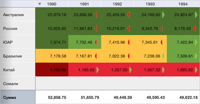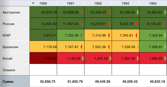 В результате выполнения примера для всей таблицы экспресс-отчёта было применено условное форматирование и отображены индикаторы роста, построенные по строкам. Для раскраски ячеек использовалась палитра, состоящая из жёлтого цвета и оттенков зелёного и красного цветов. Ячейки без данных были окрашены в серый цвет: