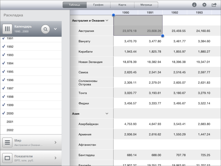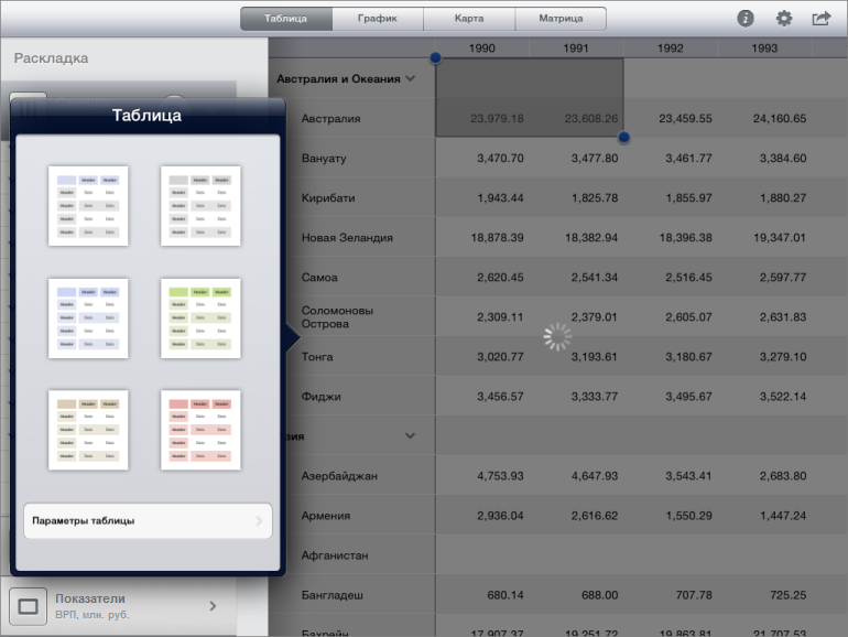 В данном примере происходит отображение панели настроек представления и индикатора загрузки, происходит выделение ячеек таблицы и устанавливается массив кнопок действий над отчетом. Спустя три секунды после запуска примера панель настроек и индикатор загрузки скрываются.
