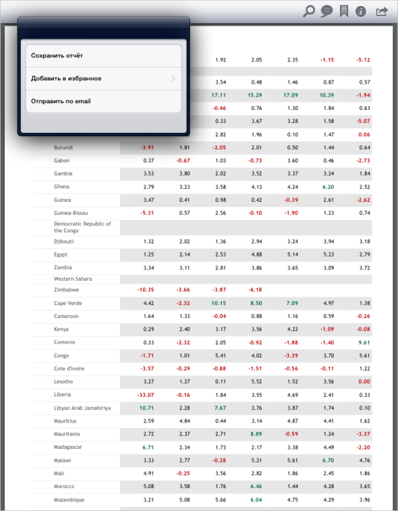 В результате выполнения примера на экране мобильного устройства будет отображен регламентный отчет, для которого показано всплывающее окно, содержащее представление действий над регламентным отчетом. Также для представления действий над регламентным отчетом задан делегат просмотрщика отчетов, с помощью которого осуществлен переход к заданной странице отчета: