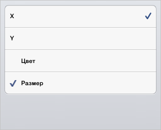 Флажки для первой и второй ячейки можно устанавливать и снимать, для третьей и четвёртой - только устанавливать. Для ячеек с ключами X_METRIC и Y_METRIC флажки располагаются слева, для ячеек с ключами COLOR_METRIC и SIZE_METRIC - справа.