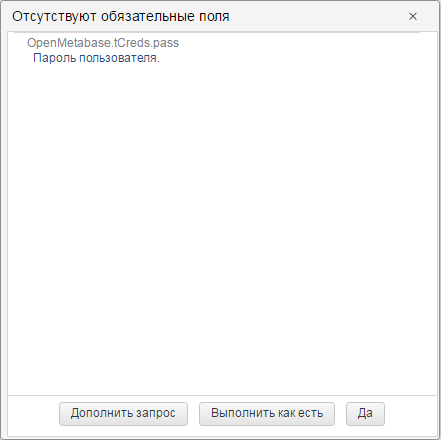 Нажатие кнопки «Дополнить запрос» позволяет в нужном месте дополнить запрос обязательными полями. После задания значений этих полей повторно нажмите кнопку «Выполнить». Кнопка «Выполнить как есть» позволяет выполнить запрос без указания обязательных полей. Кнопка «Да» закрывает диалог без каких-либо последующих действий.