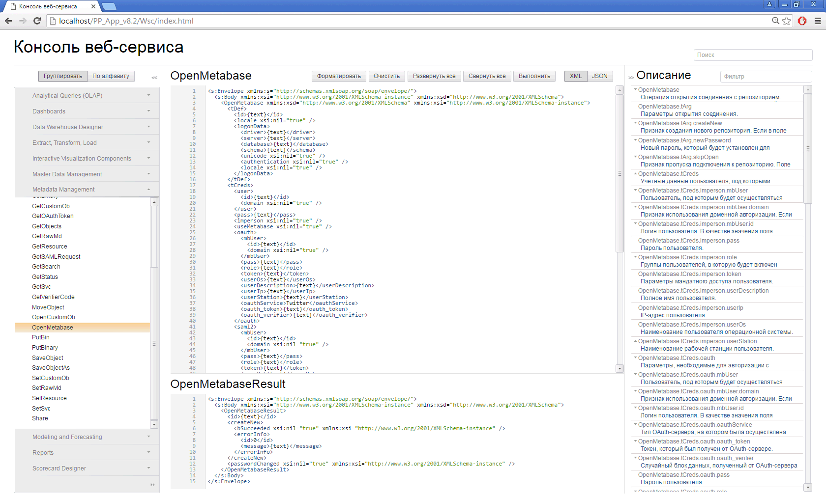 просмотр структуры запросов и ответов каждой операции в форматах XML или JSON;