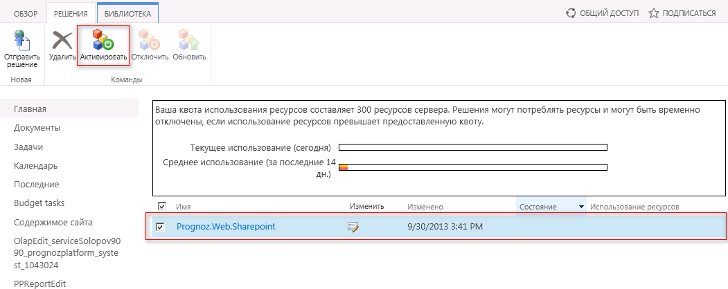 Для активации решения введите в адресной строке браузера <адрес портала>/_catalogs/solutions/Forms/AllItems.aspx. Будет открыта страница для работы с решениями. Выберите решение Prognoz.P8.Web.Sharepoint из списка и нажмите кнопку «Активировать» на вкладке ленты «Решения»: