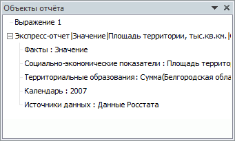 Панель предназначена для работы с объектами, вставленными в отчет. Содержимое панели отображается в виде древовидной структуры: