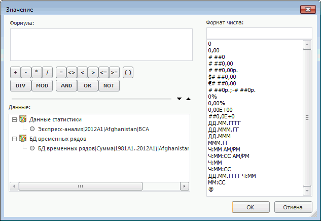 Формат числа. Область предназначена для настройки формата результирующего значения. Укажите требуемый формат из списка всех возможных форматов.