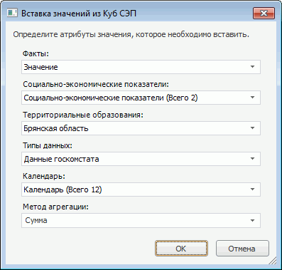 После добавления в презентацию выражения из источника (репозитория или файла) будет открыто диалоговое окно «Вставка значений из»: