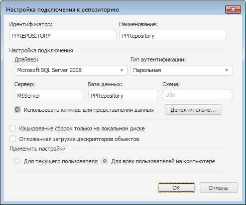 Настройка параметров репозитория осуществляется перед началом работы с Prognoz Platform 8 и может быть произведена: