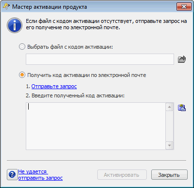 Отправьте запрос, используя гиперссылку «Отправьте запрос». Мастер активации сформирует текст письма при помощи почтового клиента, используемого по умолчанию. Если на компьютере отсутствует почтовый клиент по умолчанию или не удаётся отправить сформированное письмо, то нажмите гиперссылку «Не удаётся отправить запрос». Скопируйте отображенную информацию и отправьте на указанный адрес доступным способом. Текст письма будет содержать информацию, необходимую для получения лицензии: название проекта, единица лицензирования, цифровой отпечаток компьютера и др. Код активации продукта придет в ответном письме.