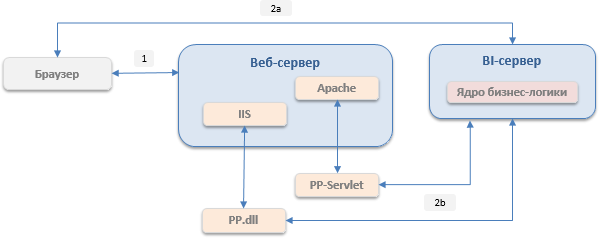 В разделе <service> указан атрибут PPServiceUrl: всё дальнейшее взаимодействие веб-приложения и BI-сервера осуществляется путем прямых запросов к BI-серверу. Обращение к веб-серверу осуществляется только при необходимости загрузки каких-либо файлов для веб-приложения.