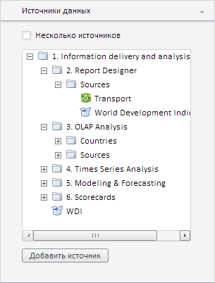 В качестве источников данных доступны кубы, дочерние кубы контейнера моделирования и базы данных временных рядов. Внешние источники данных могут быть добавлены с помощью мастера импорта данных.