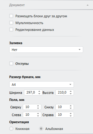 Для настройки базовых параметров аналитической панели перейдите на вкладку «Документ» боковой панели.