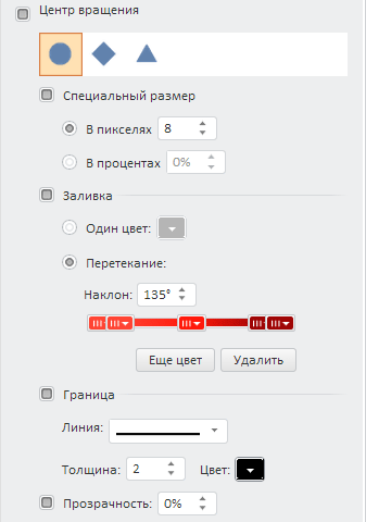 Заливка. Параметры заливки фона центра вращения. По умолчанию флажок снят и заливка фона не применяется. Для настройки заливки установите флажок и установите переключатель, соответствующий способу заливки: