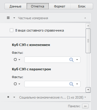 Для управления измерениями источников данных используйте группу вкладок «Отметка»: общие измерения отображаются на отдельных вкладках, частные - на вкладке «Частные измерения». Например: