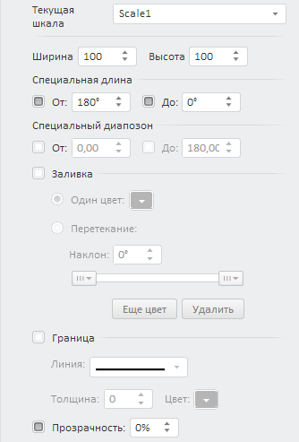 Прозрачность. Параметры прозрачности шкалы. По умолчанию флажок установлен и доступна настройка степени прозрачности шкалы: 100% соответствует полной прозрачности (шкала станет невидимой), 0% соответствует полной непрозрачности.