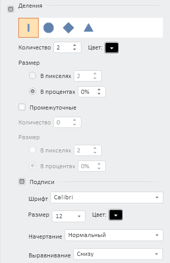 Промежуточные. Параметры промежуточных делений шкалы. Для отображения промежуточных делений установите флажок и задайте количество, цвет и размер делений;