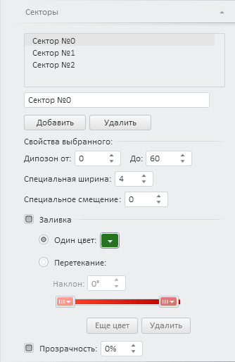 Для настройки секторов индикатора предназначена вкладка «Секторы», расположенная на боковой панели. Секторы позволяют визуально выделить диапазоны значений шкалы индикатора. Для каждой шкалы может быть создан отдельный набор секторов.