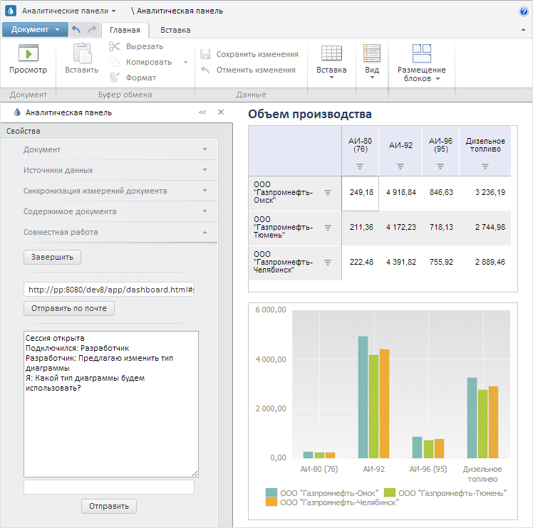 Режим совместной работы позволяет обмениваться сообщениями и конструировать аналитическую панель сразу нескольким пользователям. Владелец аналитической панели может управлять возможностью редактирования панели.