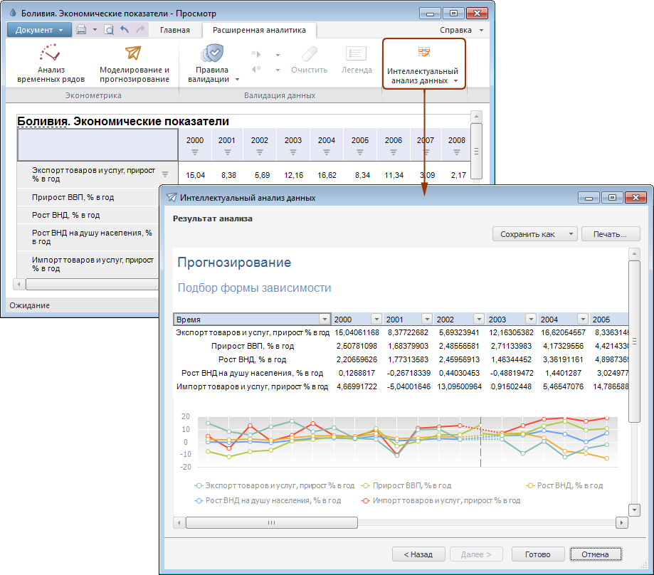 Примечание. Работа с эконометрикой доступна, если источником данных таблицы или области данных является база данных временных рядов.