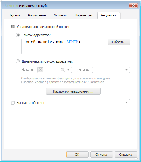 Для настройки вариантов обработки результата выполнения задачи используйте вкладку «Результат» в диалоге настройки параметров задачи.