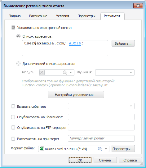 Для задачи вычисления регламентного отчета доступны дополнительные варианты обработки результата: