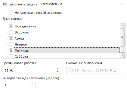Интервал между запусками. Задает количество недель, через которое будет производиться запуск задачи на выполнение;