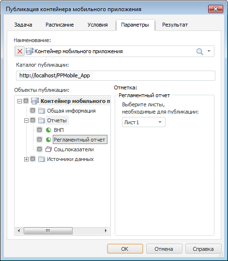 Отметка. Если для объекта доступны дополнительные настройки публикации, то они отображаются в данной группе. Все настройки аналогичны настройкам, задаваемым при публикации мобильного приложения без использования контейнера запланированных задач.