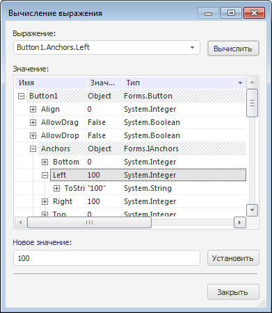 При первом открытии окна будет осуществлен автоматический расчет указанного выражения. Результат вычисления будет представлен в виде дерева, содержащего все свойства объекта и их значения. Глубина иерархии вычисления любого свойства равна семи уровням. При изменении текста в поле «Выражение» для расчета новых значений необходимо нажать кнопку «Вычислить».