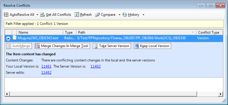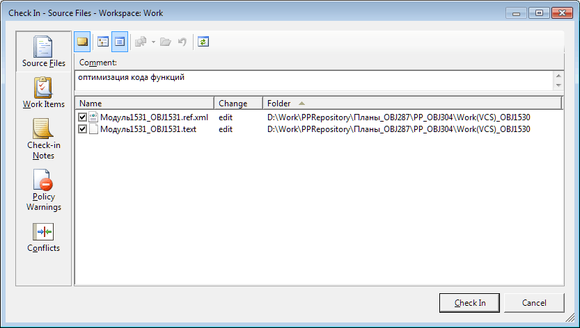 После нажатия кнопки «Check In» на сервере будут обновлены версии файлов, добавлена запись в историю изменений. При публикации могут возникнуть конфликты версий, если один и тот же объект был отредактирован разными пользователями. Данные конфликты решаются стандартными средствами VCS.