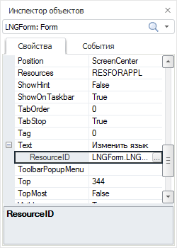 Укажите ранее созданные ресурсы «ResForAppl» и нажмите кнопку «ОК». После этого в инспекторе объектов у всех визуальных компонентов к свойствам текстового типа будет добавлен дополнительный атрибут «ResourcesID». Значение данного атрибута будет формироваться автоматически: