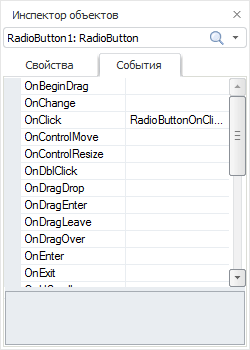 В инспекторе объектов выберите компонент RadioButton1 и перейдите на вкладку «События».