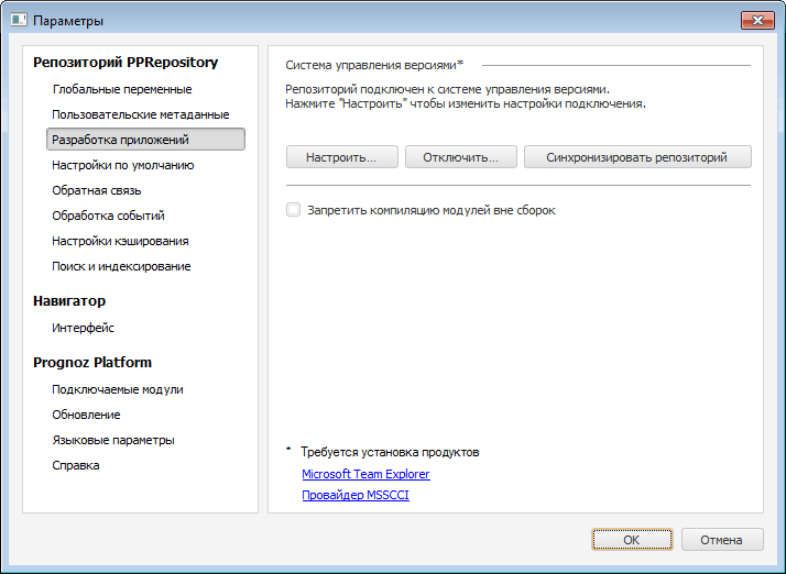 Параметры разработки приложений включают в себя параметры подключения к системе управления версиями и дополнительные параметры, определяющие способ работы с объектами среды разработки.