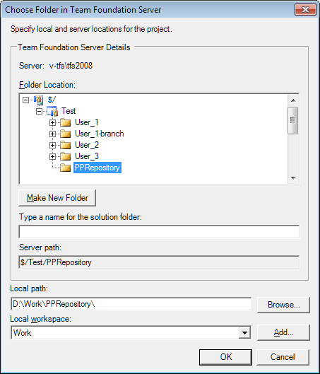 Для создания списка серверов используйте кнопку «Servers». После выбора сервера появится окно для установления соответствия папок на сервере TFS и на локальном диске: