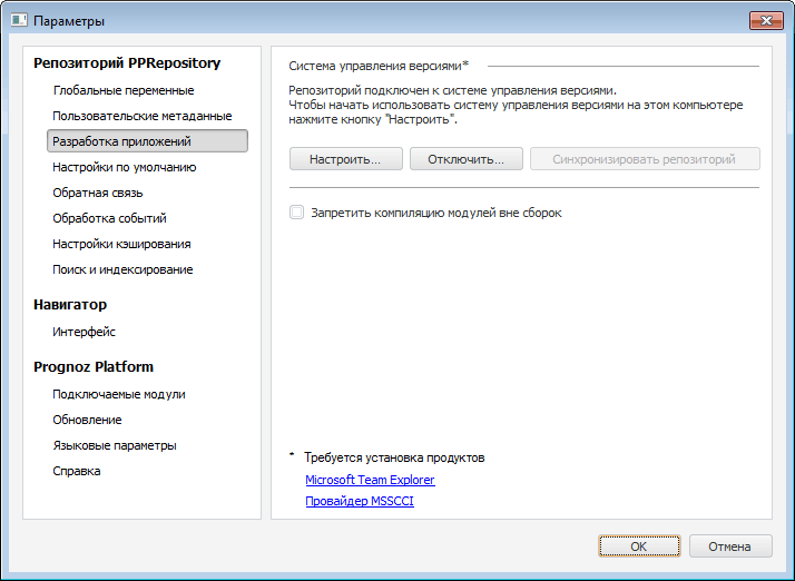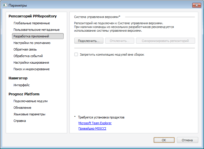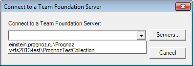 На данной вкладке осуществляется настройка репозитория для работы с Team Foundation Server (TFS). При нажатии кнопки «Подключить» появится окно для выбора сервера TFS: